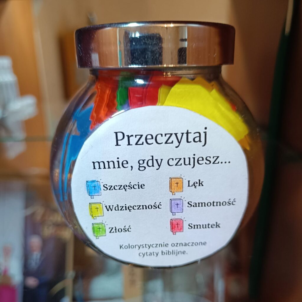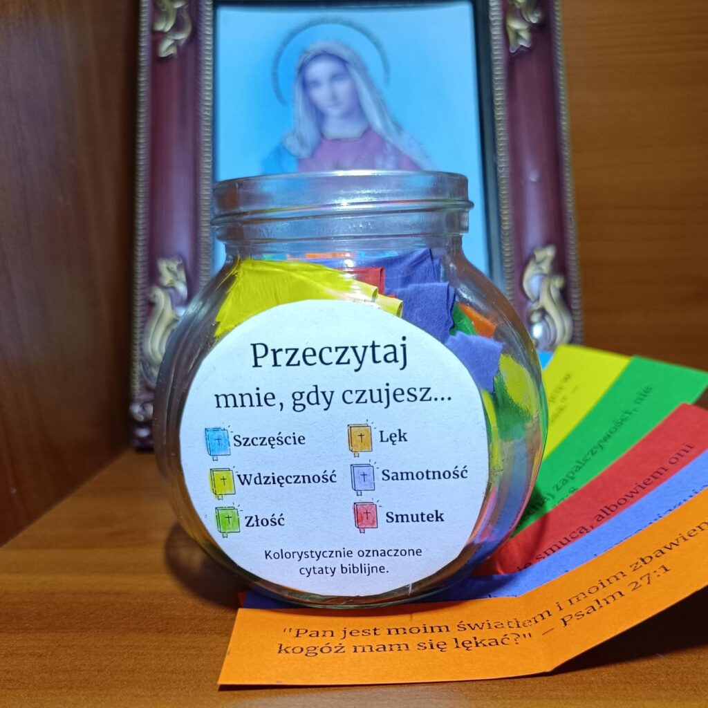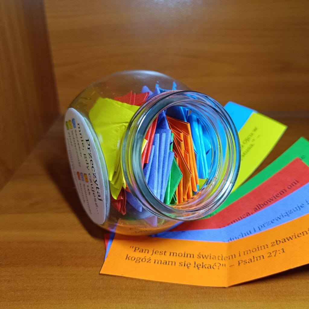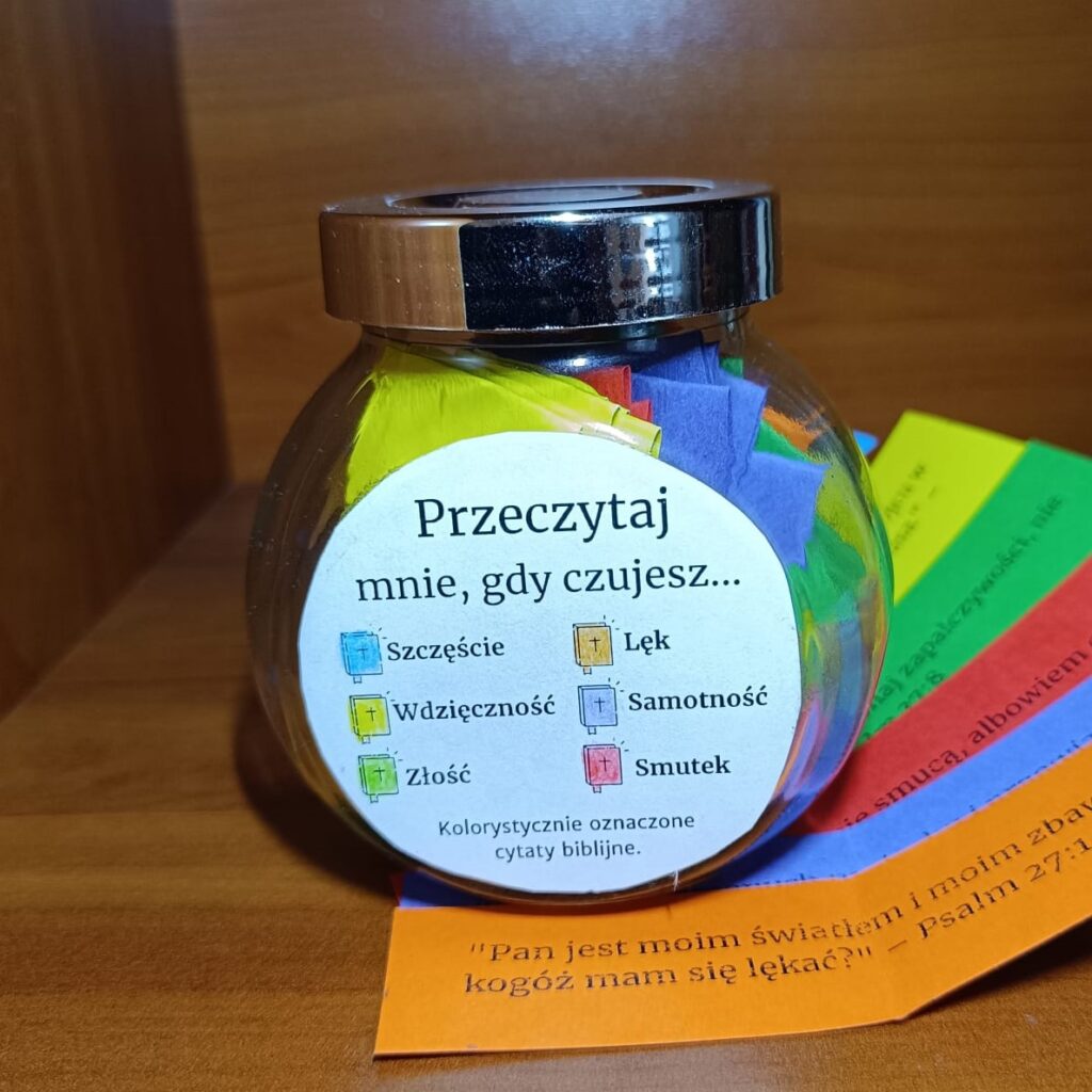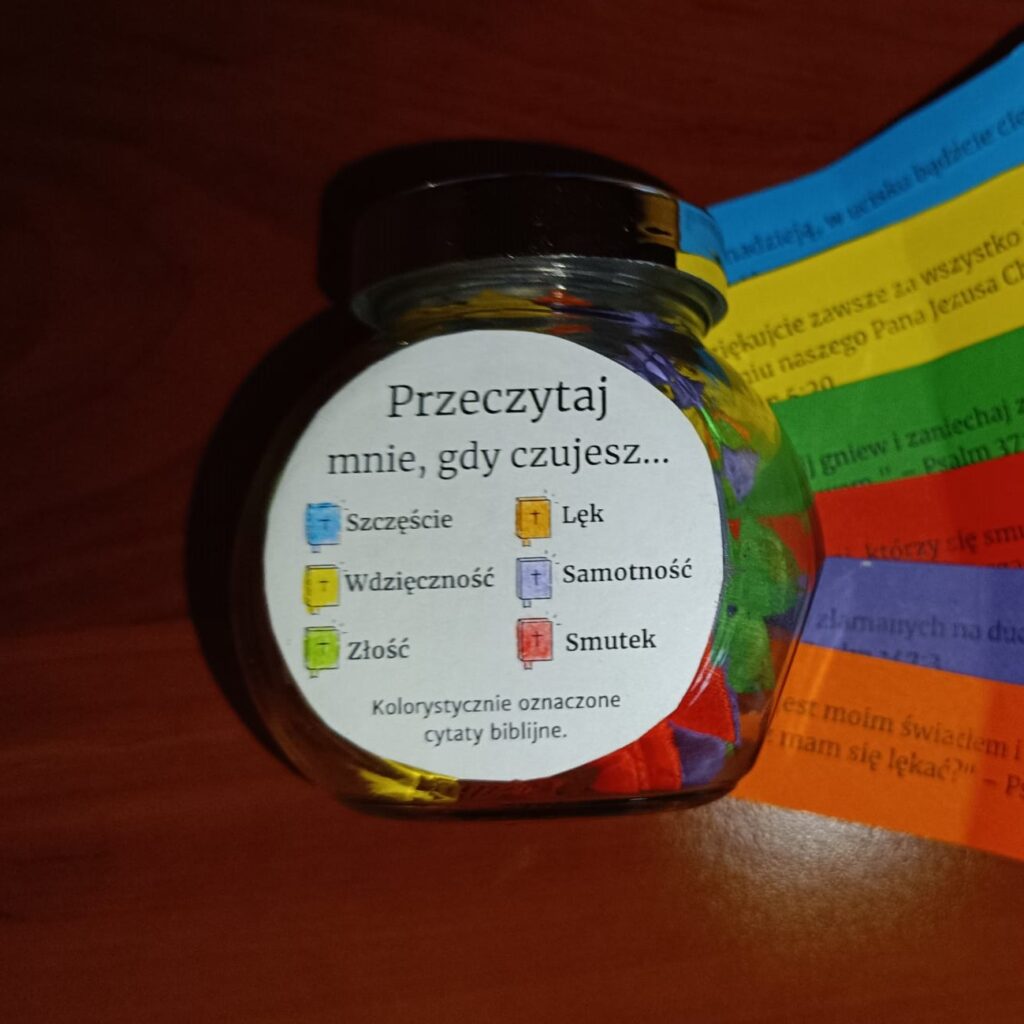 W słoiczku znajdują się cytaty biblijne dobrane do różnych emocji, takich jak radość, smutek, lęk, złość, samotność i wdzięczność.